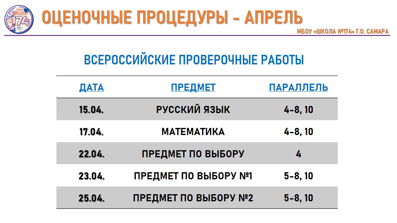 График проведения ВПР в МБОУ "Школа № 174" г.о. Самара